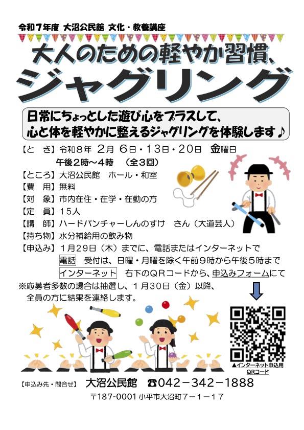 - 6日(金) 小平市大沼公民館 文化・教養講座 大人のための軽やか習慣、ジャグリング(受付終了)
